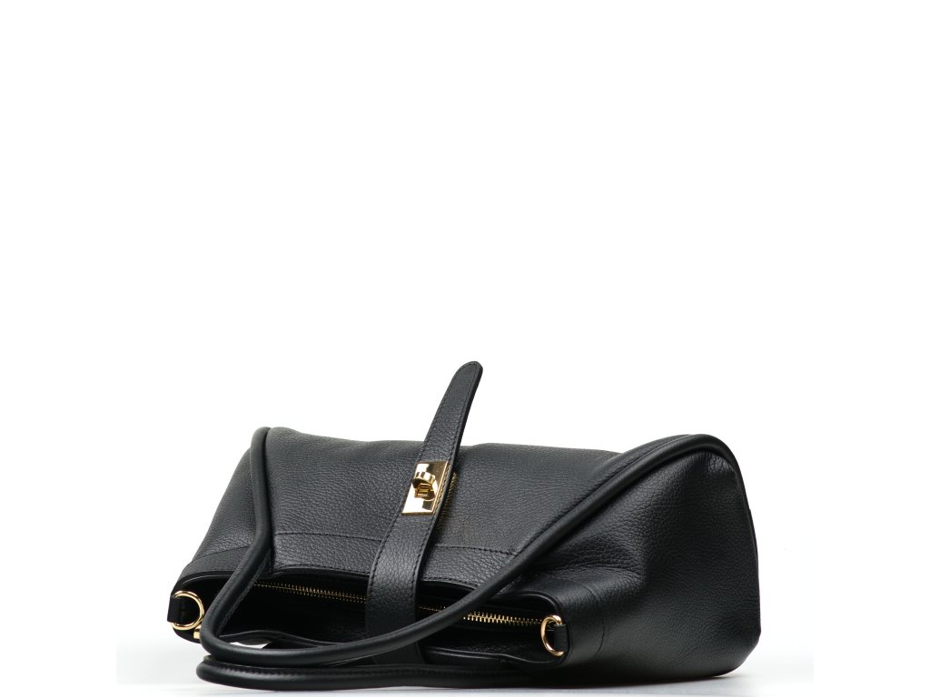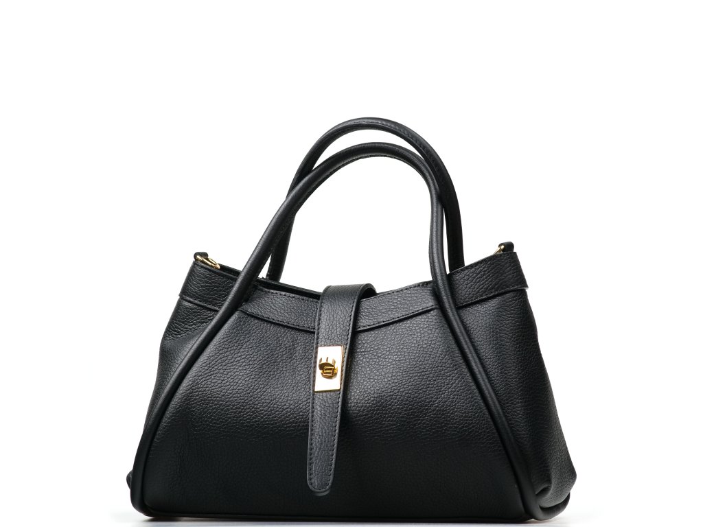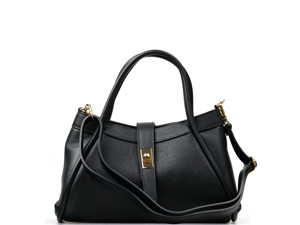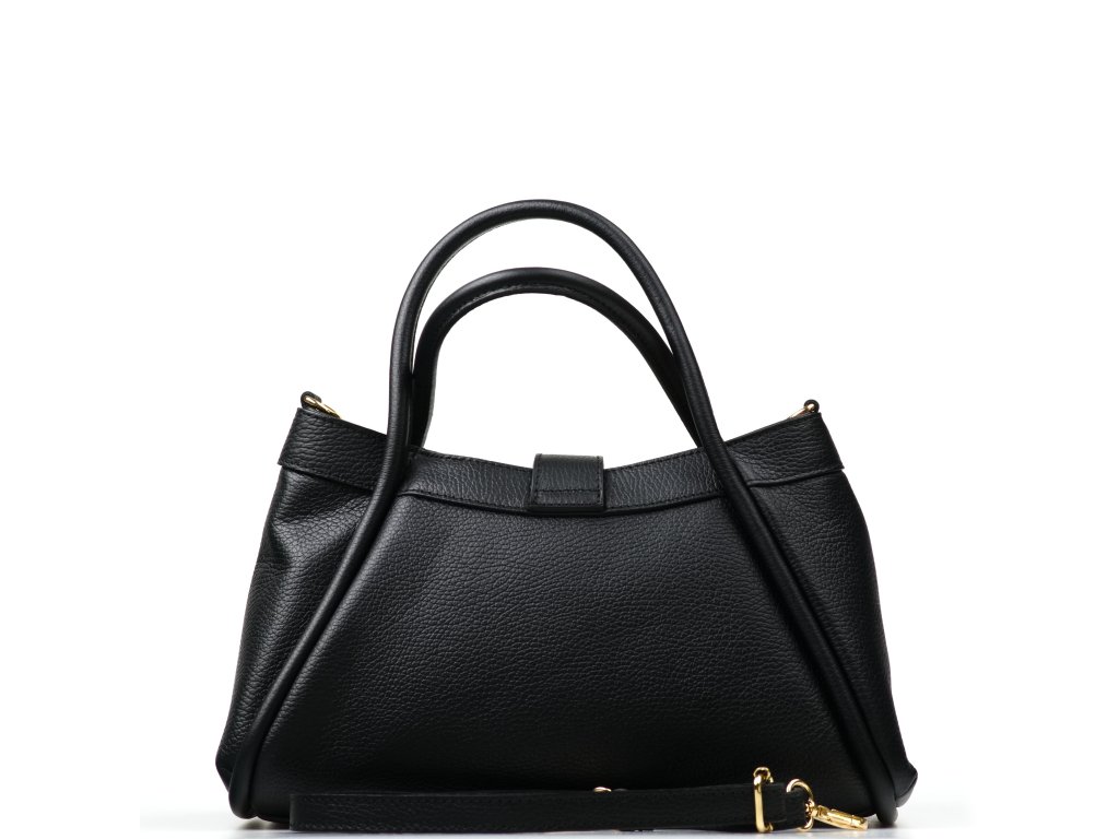 Elegantná kožená kabelka do ruky alebo cez rameno v čiernej farbe. Kabelku je možné nosiť aj ako crossbody vďaka prídavnému popruhu. Interiér disponuje jedným veľkým úložným vreckom a jedným malým na drobné veci. Kabelka sa uzatvára zipsom a ozdobnou chlopňou.