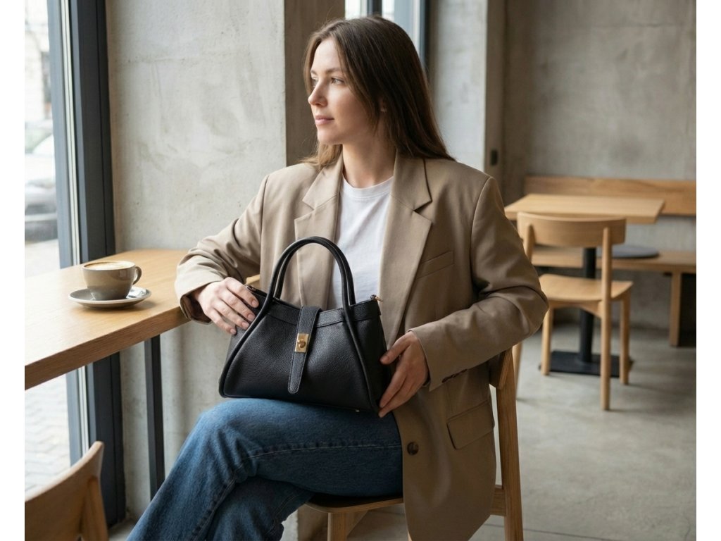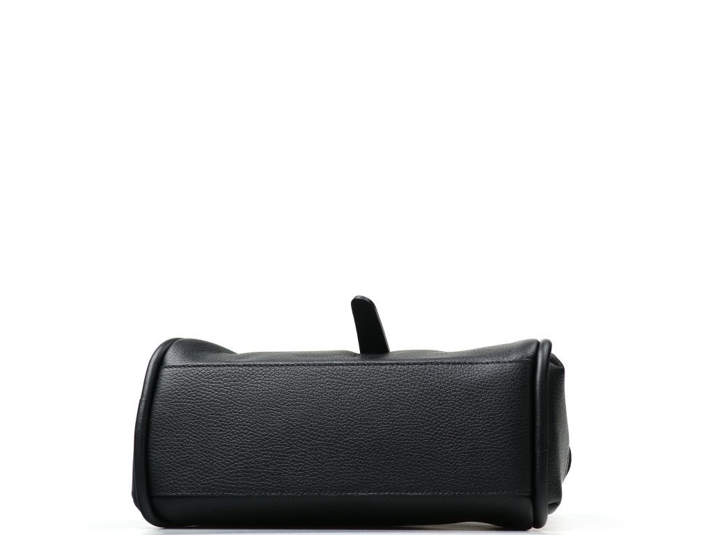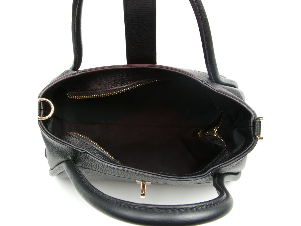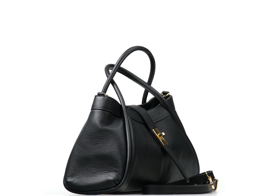 Elegantná kožená kabelka do ruky alebo cez rameno v čiernej farbe. Kabelku je možné nosiť aj ako crossbody vďaka prídavnému popruhu. Interiér disponuje jedným veľkým úložným vreckom a jedným malým na drobné veci. Kabelka sa uzatvára zipsom a ozdobnou chlopňou.