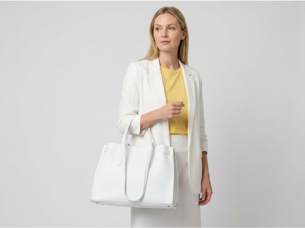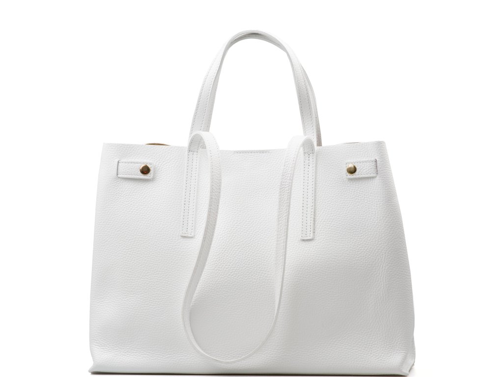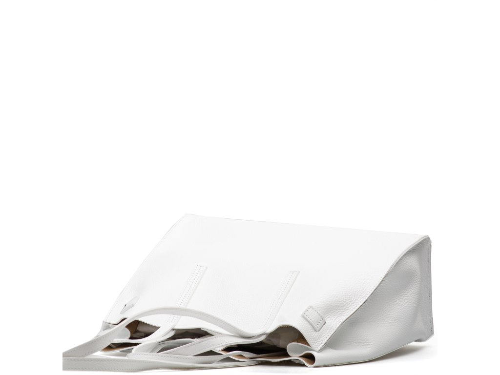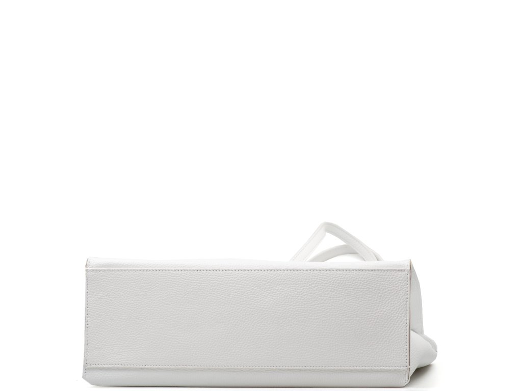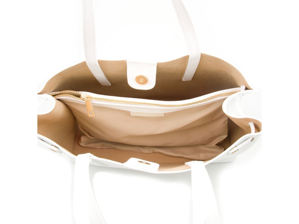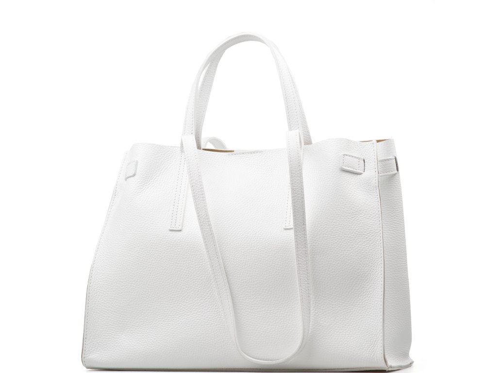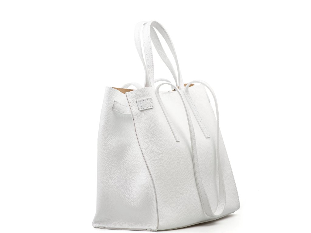 Minimalistická kožená kabelka v bielej farbe, ktorú môžete nosiť elegantne v ruke aj pohodlne cez rameno. Interiér ponúka jedno veľké hlavné vrecko na každodenné nevyhnutnosti a navyše pevné prídavné vrecko na zips – ideálne na drobnosti, ktoré chcete mať zvlášť av bezpečí (napr. kľúče, karty alebo rúž). Kabelka sa uzatvára cvokom, takže ju rýchlo otvoríte aj zatvorte počas chvíľky.
