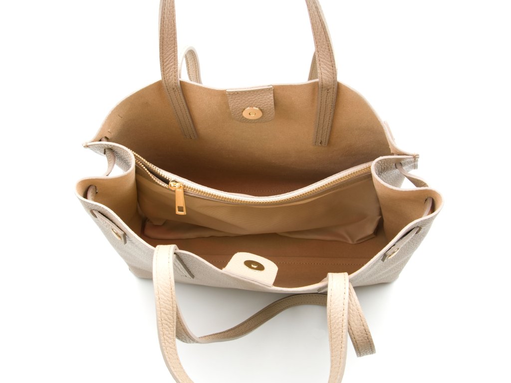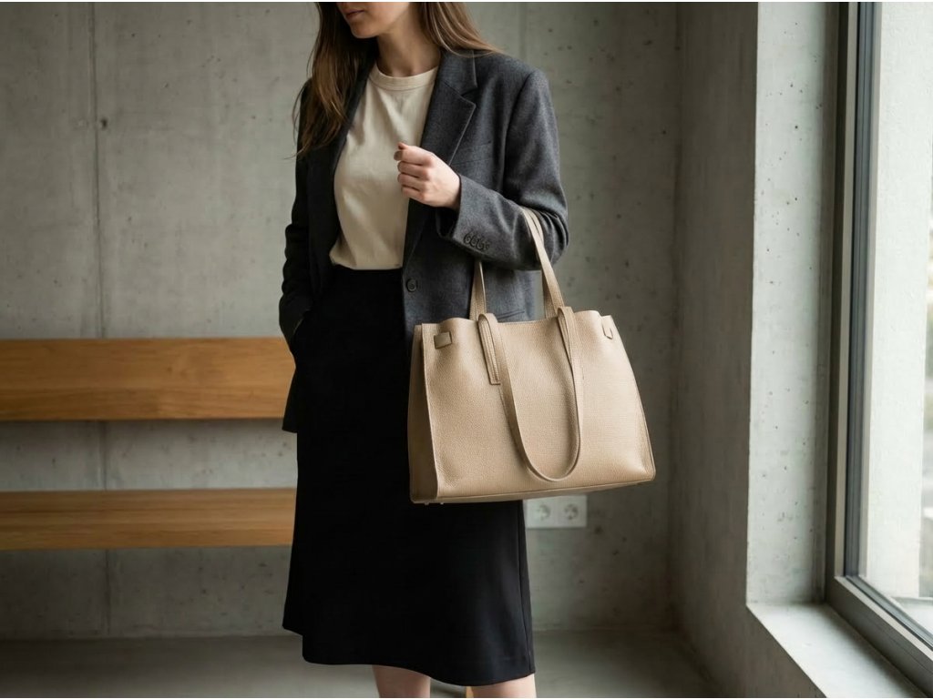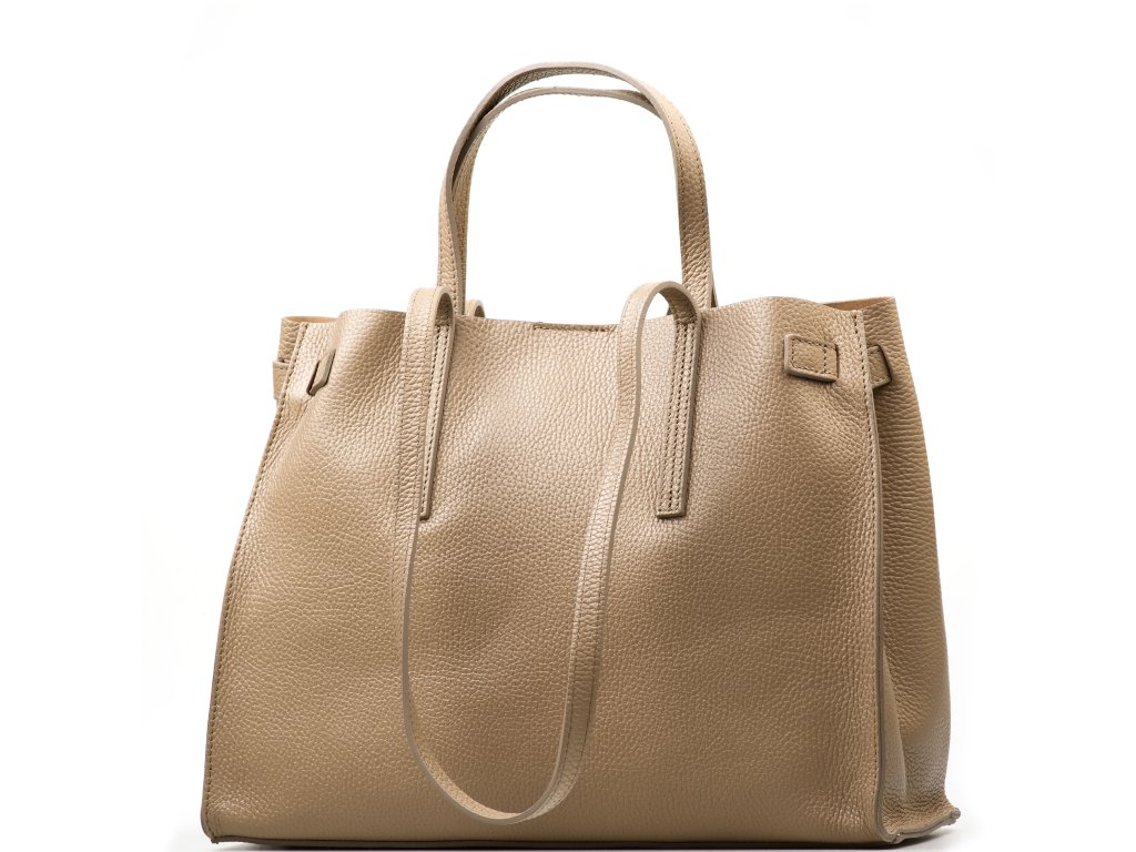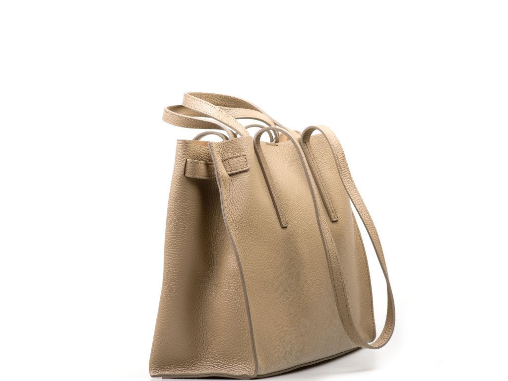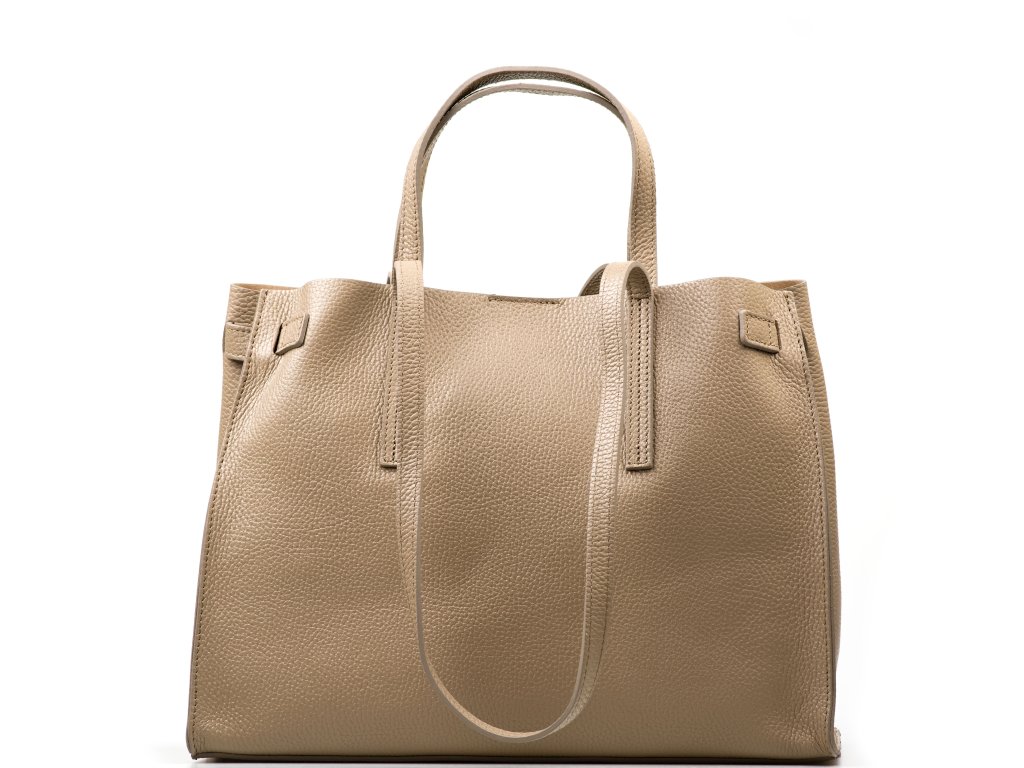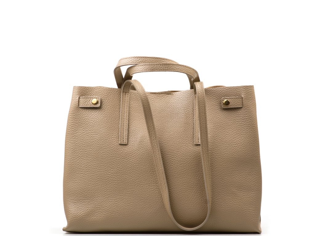 Minimalistická kožená kabelka vo fango farbe, ktorú môžete nosiť elegantne v ruke aj pohodlne cez rameno. Interiér ponúka jedno veľké hlavné vrecko na každodenné nevyhnutnosti a navyše pevné prídavné vrecko na zips – ideálne na drobnosti, ktoré chcete mať zvlášť av bezpečí (napr. kľúče, karty alebo rúž). Kabelka sa uzatvára cvokom, takže ju rýchlo otvoríte aj zatvorte počas chvíľky.