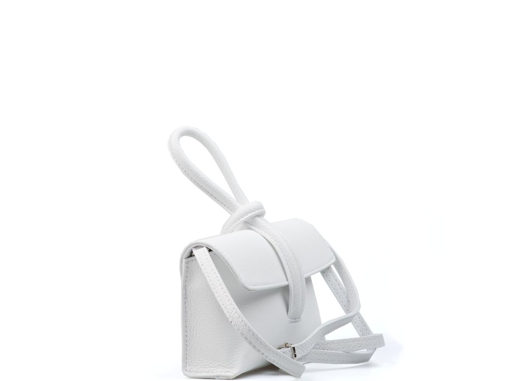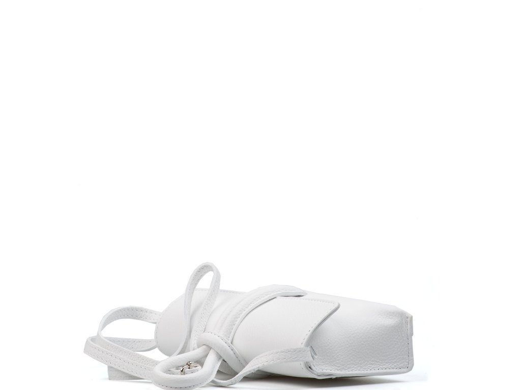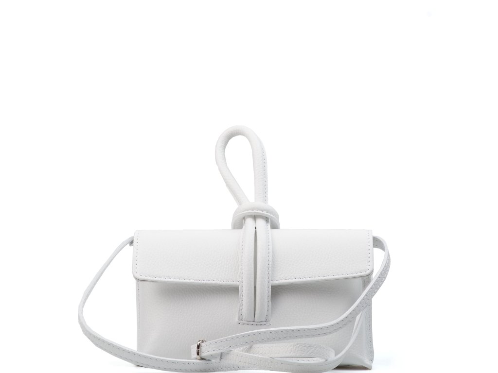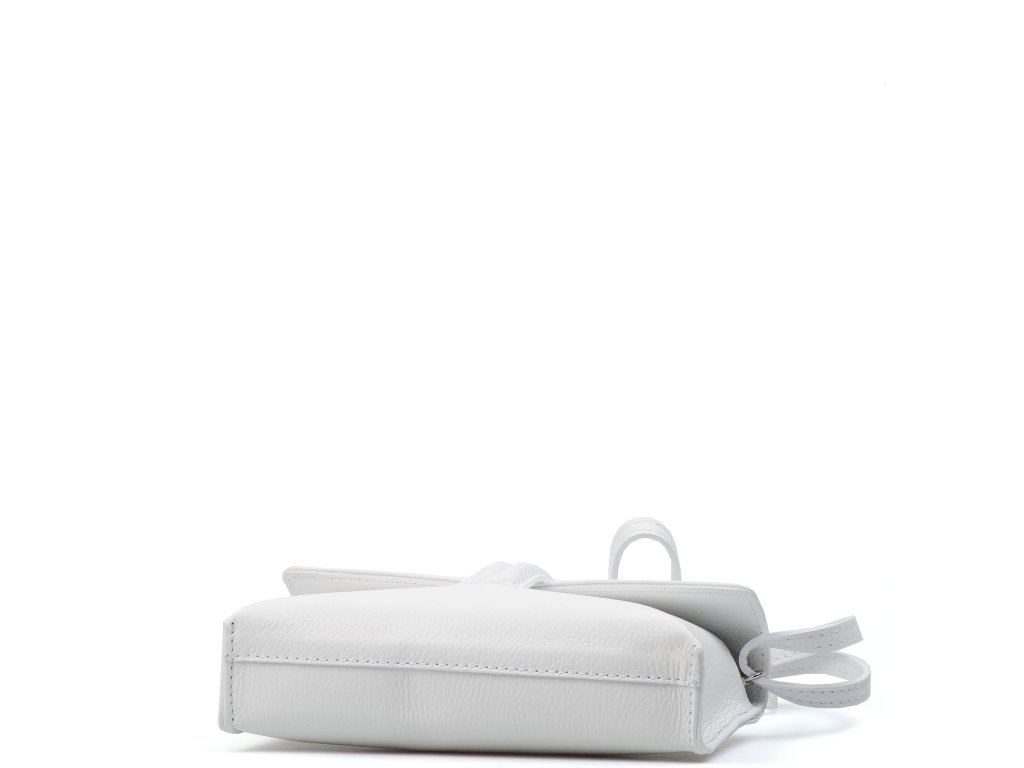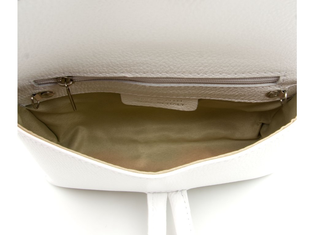 Dámska kožená kabelka v bielej farbe. Minimalistická kabelka vyrobená z matnej kože. Súčasťou kabelky je prídavný popruh s karabínami, pričom ju môžete nosiť aj ako listovú kabelku. Interiér disponuje jedným veľkým a jedným malým úložným vreckom.