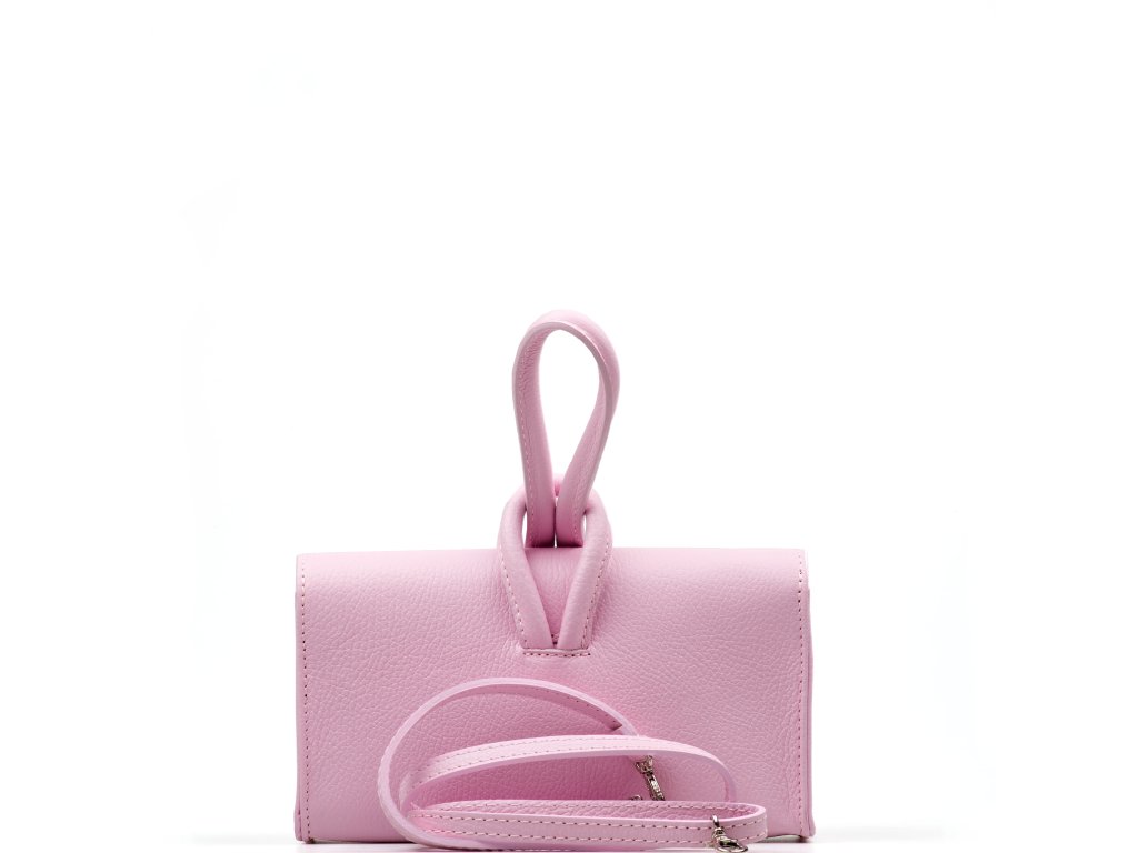 Dámska kožená kabelka vo svetlo ružovej farbe. Minimalistická kabelka vyrobená z matnej kože. Súčasťou kabelky je prídavný popruh s karabínami, pričom ju môžete nosiť aj ako listovú kabelku. Interiér disponuje jedným veľkým a jedným malým úložným vreckom.