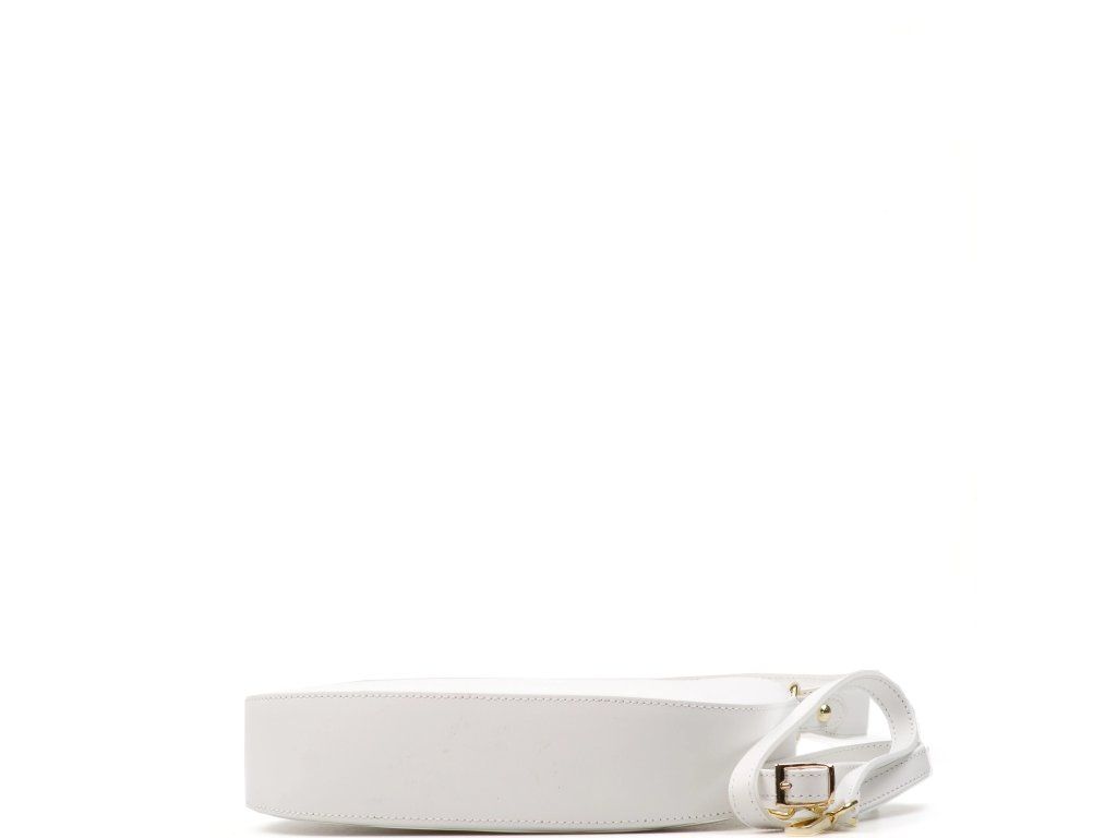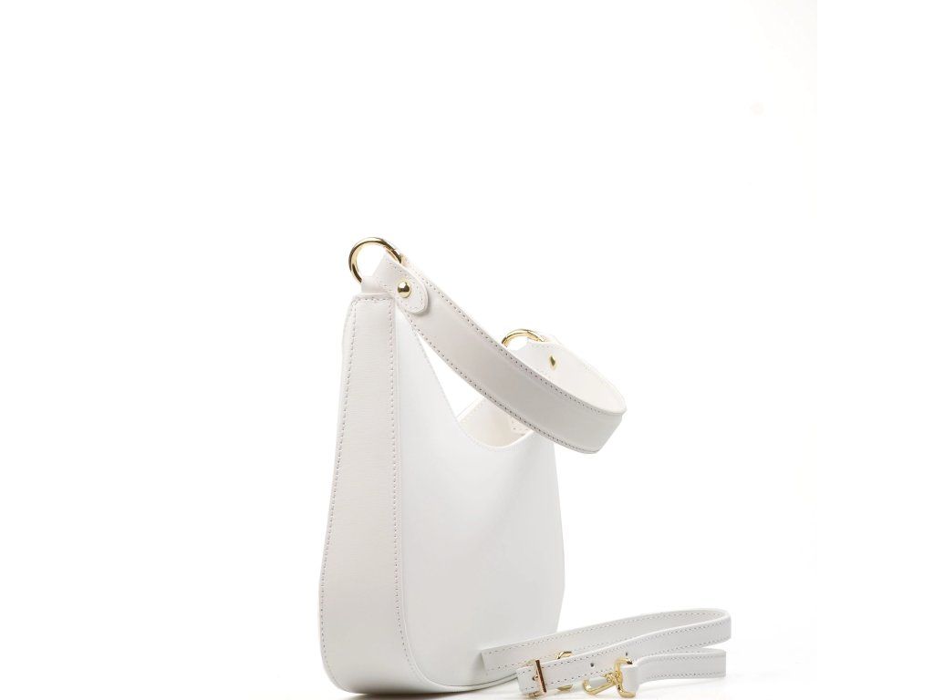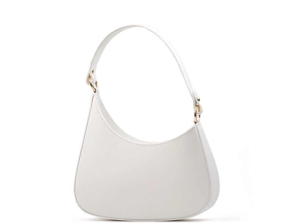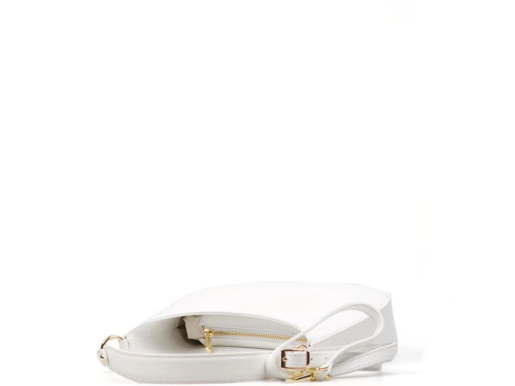 Minimalistická kožená kabelka do ruky v bielej farbe. Kabelka je vyrobená z hladkej kože a jej tvar je asymetrický. Interiér kabelky disponuje jedným hlavným vreckom a jedným zadným malým. Kabelka ich uzatvára zipsom. Súčasťou kabelky je prídavný popruh s karabínami, na použitie kabelky ako crossbody.