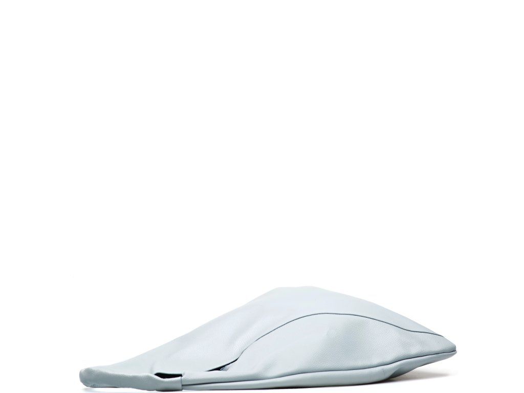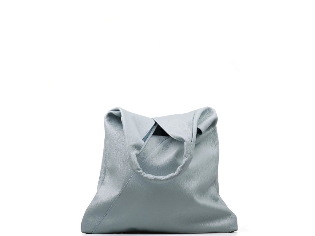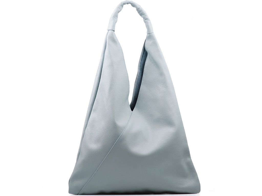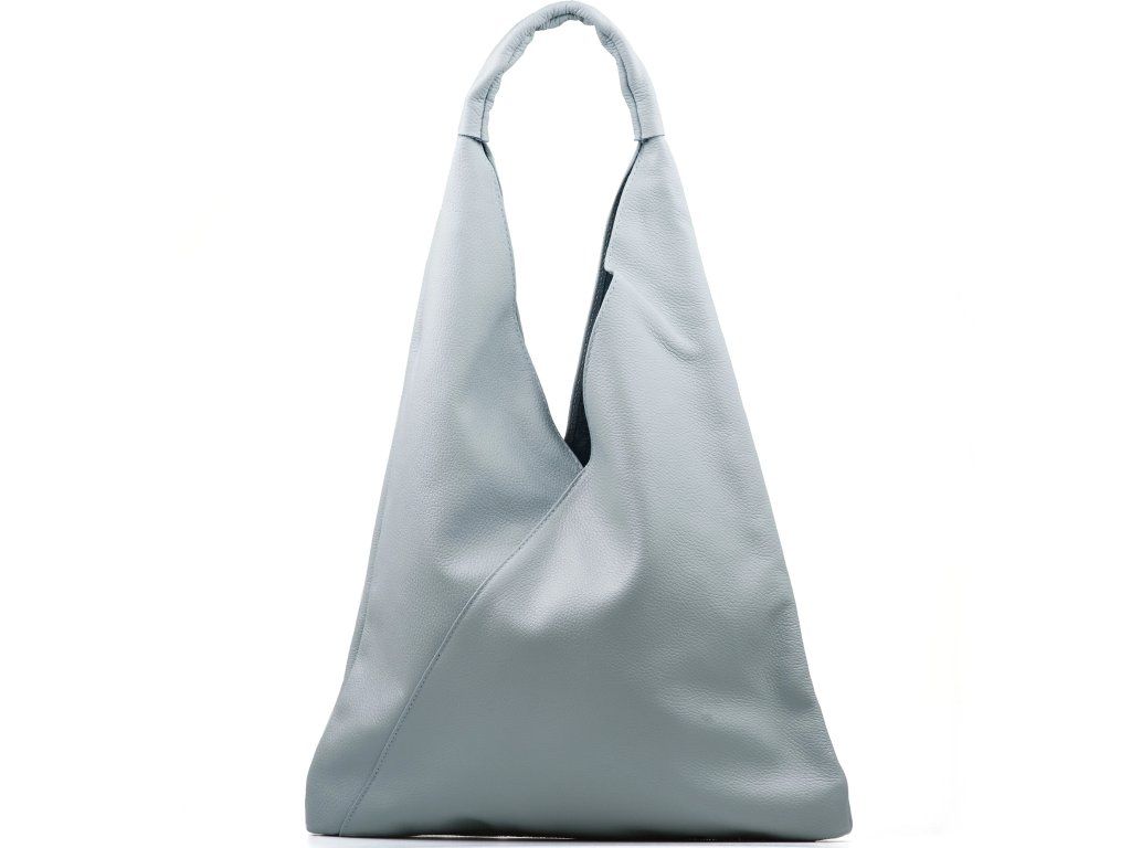 Kožená minimalistická maxi kabelka cez rameno vo svetlo modrej farbe je ideálnym kúskom pre tých, ktorí preferujú jednoduchosť a štýl. Jej unikátny geometrický trojuholníkový tvar priťahuje pozornosť a dodáva vášmu outfitu moderný nádych. Vnútri kabelky nájdete priestranné hlavné vrecko, ktoré pojme všetky vaše nevyhnutnosti, a menšie vrecko, ideálne pre drobnosti ako sú kľúče alebo rúž. Kabelka sa uzatvára originálnym spôsobom a to zviazaním kožených šnúrok.