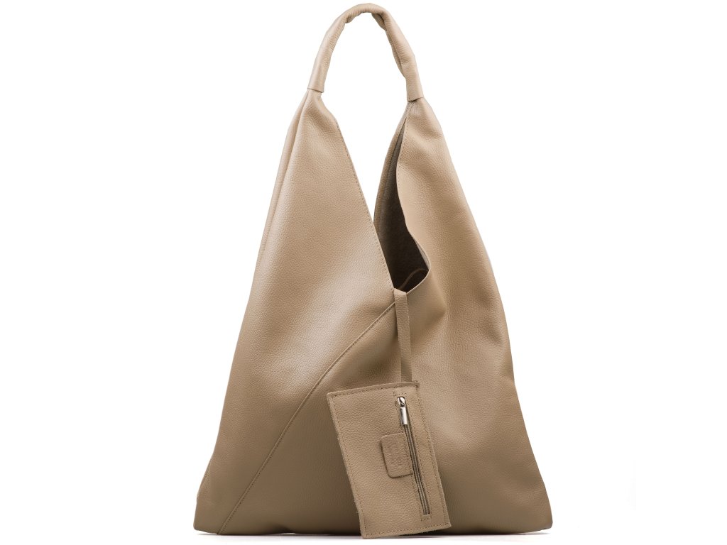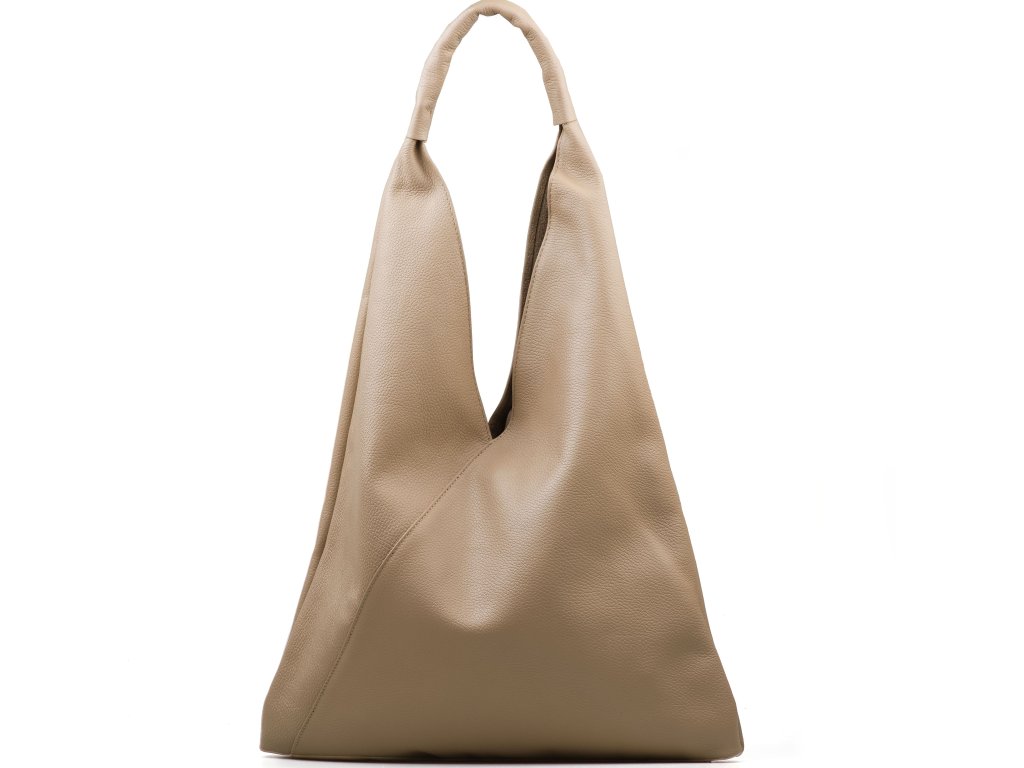 Kožená minimalistická maxi kabelka cez rameno v taupe farbe je ideálnym kúskom pre tých, ktorí preferujú jednoduchosť a štýl. Jej unikátny geometrický trojuholníkový tvar priťahuje pozornosť a dodáva vášmu outfitu moderný nádych. Vnútri kabelky nájdete priestranné hlavné vrecko, ktoré pojme všetky vaše nevyhnutnosti, a menšie vrecko, ideálne pre drobnosti ako sú kľúče alebo rúž. Kabelka sa uzatvára originálnym spôsobom a to zviazaním kožených šnúrok.