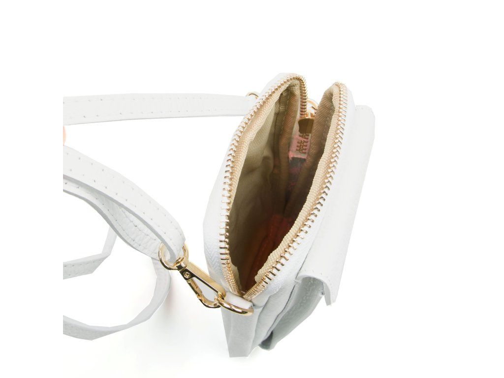 Kožená mini kabelka na telefón a drobnosti v bielej farbe. Súčasťou kabelky je prídavný popruh s karabínami. Interiér kabelky má jedno vrecko. Na prednej strane kabelky je jedno funkčné vrecko, ktoré sa uzatvára klopou na cvoček. Kabelka sa uzatvára zipsom.