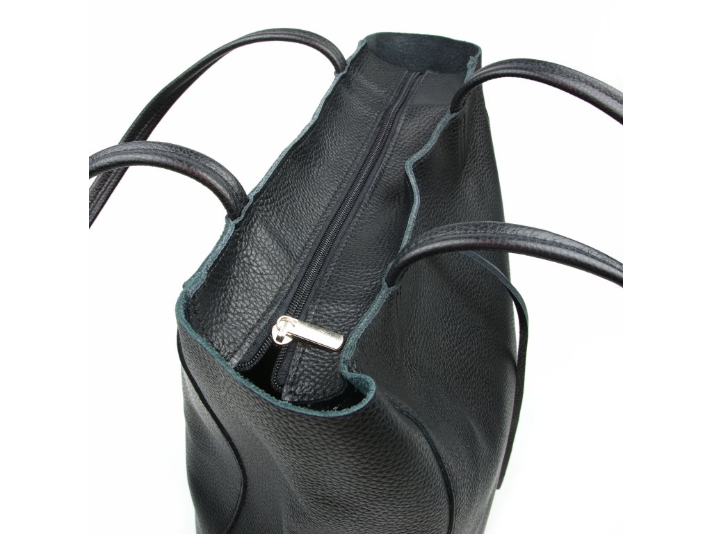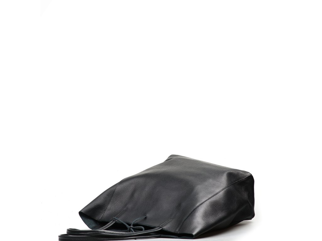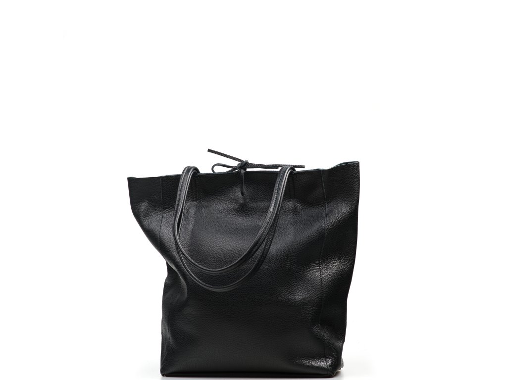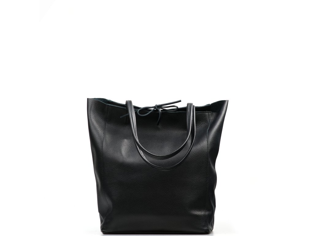 Veľká kožená shopper kabelka v čiernej farbe. Minimalistická a priestranná taška ideálna na voľný čas aj každodenné nosenie. Ponúka jedno hlavné úložné vrecko a menšie bočné vrecko na drobnosti. V hornej časti sa uzatvára zipsom a navyše sa sťahuje koženou šnúrkou, ktorá dodáva kabelke elegantný detail a zvyšuje bezpečnosť uloženia vecí.
