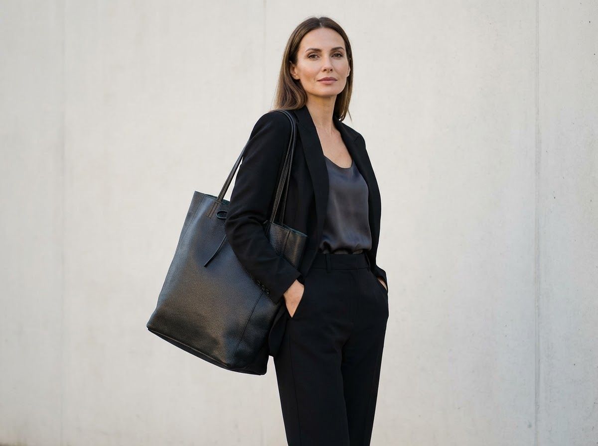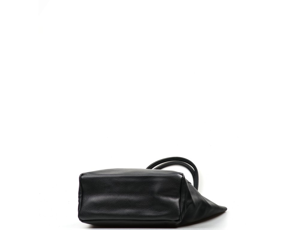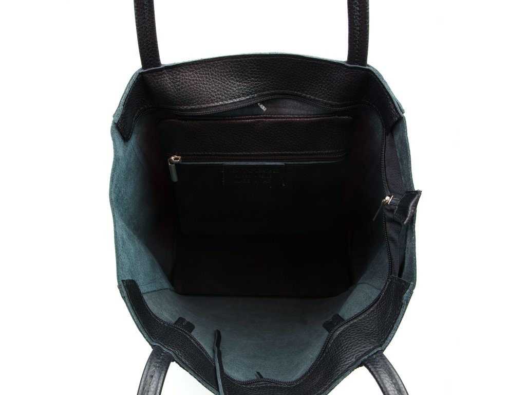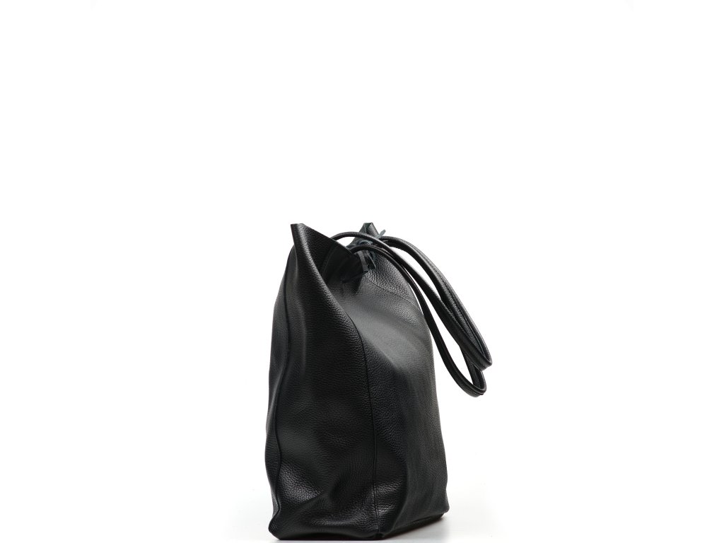 Veľká kožená shopper kabelka v čiernej farbe. Minimalistická a priestranná taška ideálna na voľný čas aj každodenné nosenie. Ponúka jedno hlavné úložné vrecko a menšie bočné vrecko na drobnosti. V hornej časti sa uzatvára zipsom a navyše sa sťahuje koženou šnúrkou, ktorá dodáva kabelke elegantný detail a zvyšuje bezpečnosť uloženia vecí.