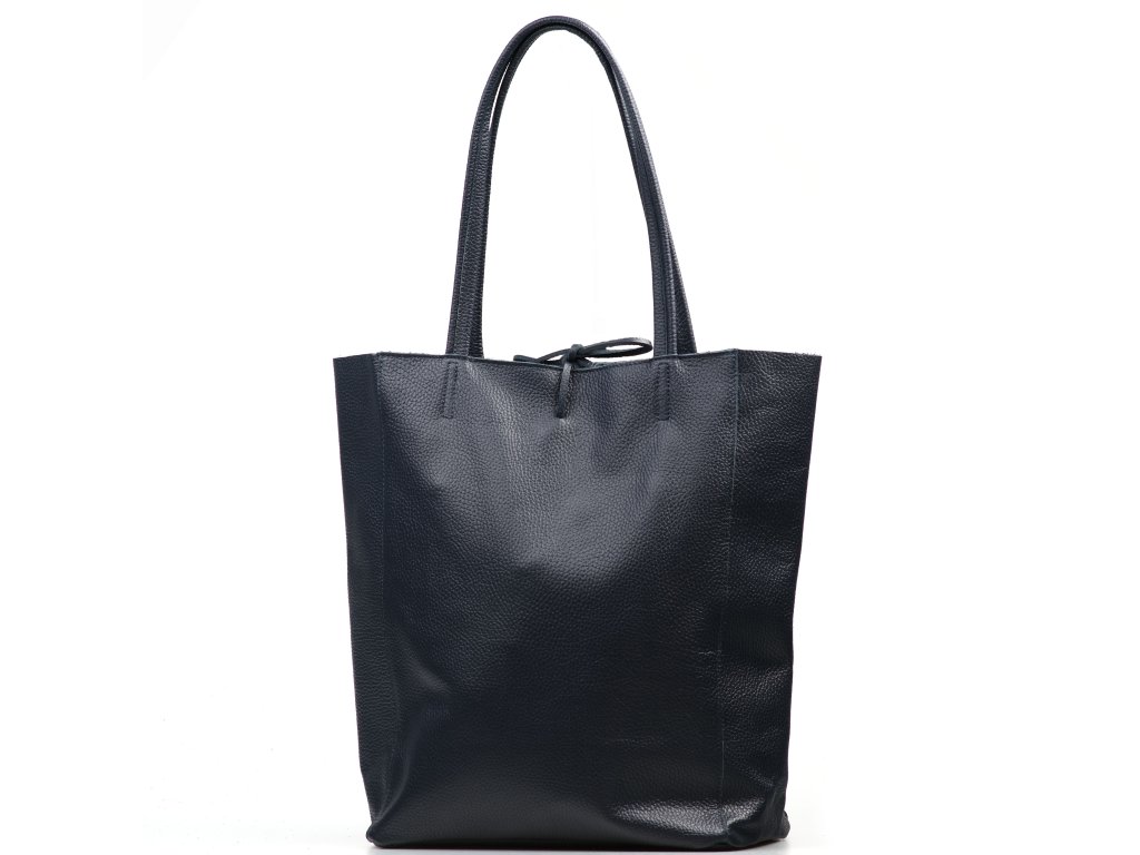 Veľká kožená shopper kabelka v tmavo modrej farbe. Minimalistická a priestranná taška ideálna na voľný čas aj každodenné nosenie. Ponúka jedno hlavné úložné vrecko a menšie bočné vrecko na drobnosti. V hornej časti sa uzatvára zipsom a navyše sa sťahuje koženou šnúrkou, ktorá dodáva kabelke elegantný detail a zvyšuje bezpečnosť uloženia vecí.