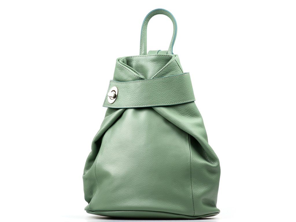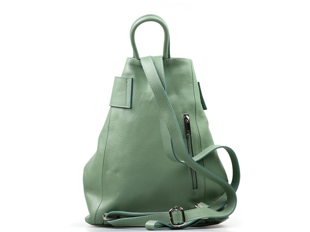Dámsky kožený batôžtek v mätovo zelenej farbe. Zadná strana kabelky je vybavená funkčným vreckom na zips. Kovanie je strieborné. Horná časť batôžku sa prekladá a zatvára sponou. Interiér kabelky disponuje jedným úložným vreckom a malými po vnútorných bokoch. Batôžtek sa zatvára zipsom.
