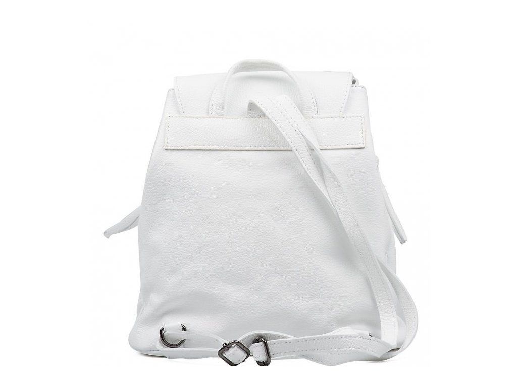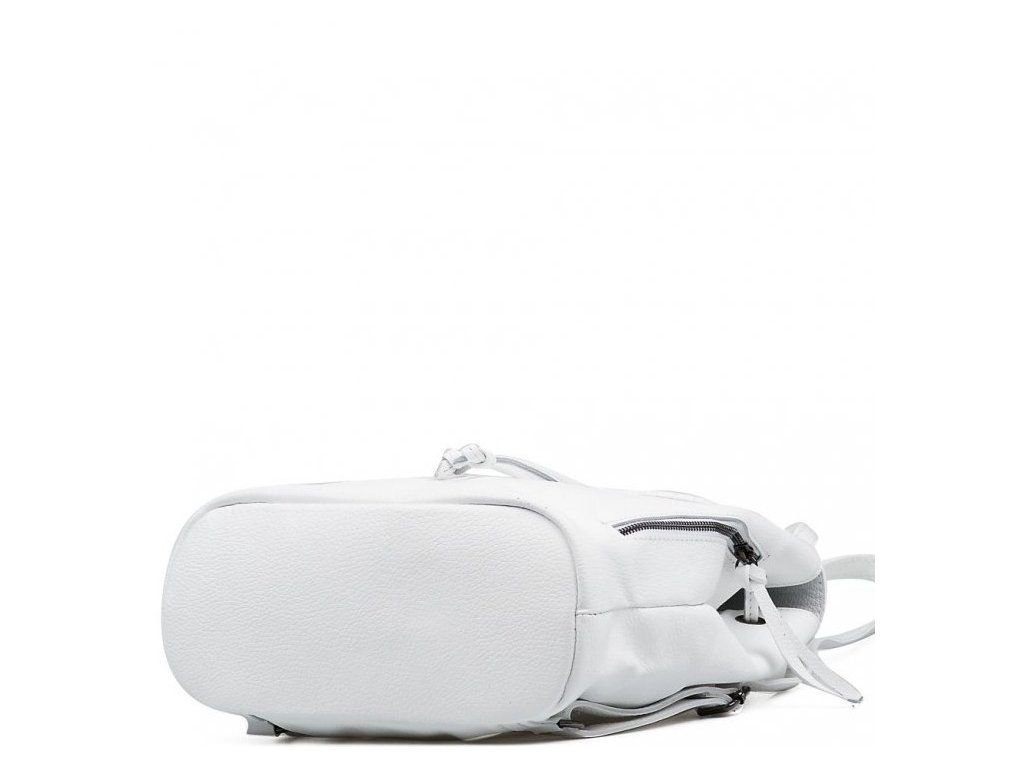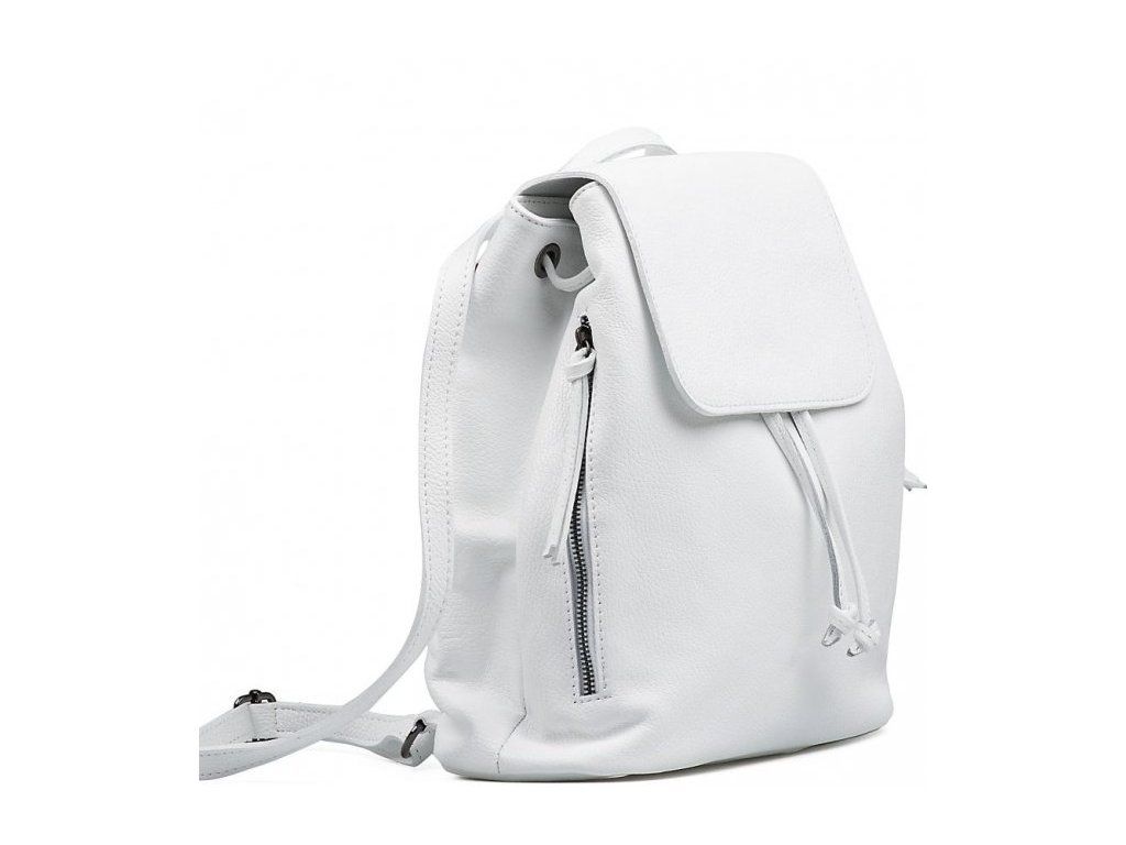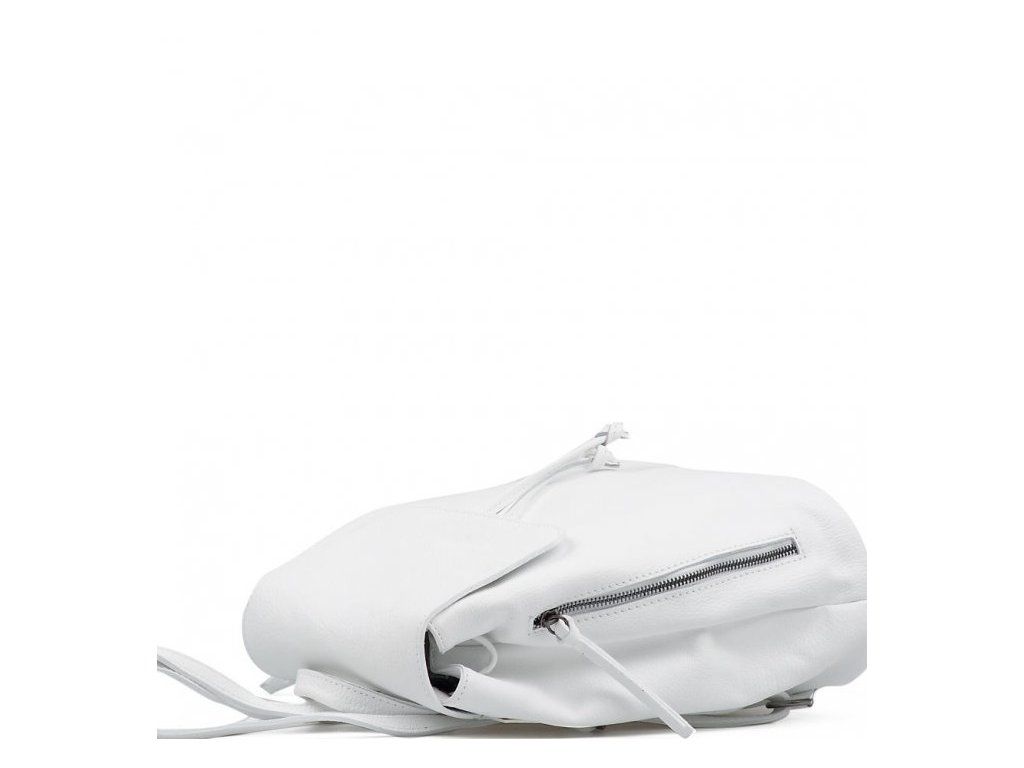 Dámsky kožený batôžtek v bielej farbe. Po bokoch je kabelka vybavená funkčnými vreckami na zips. Kovanie je strieborné. Horná časť batôžku sa sťahuje koženou šnúrkou. Kabelka sa zatvára klopou na cvoček. Interiér disponuje jedným veľkým úložným vreckom a malými po bokoch.