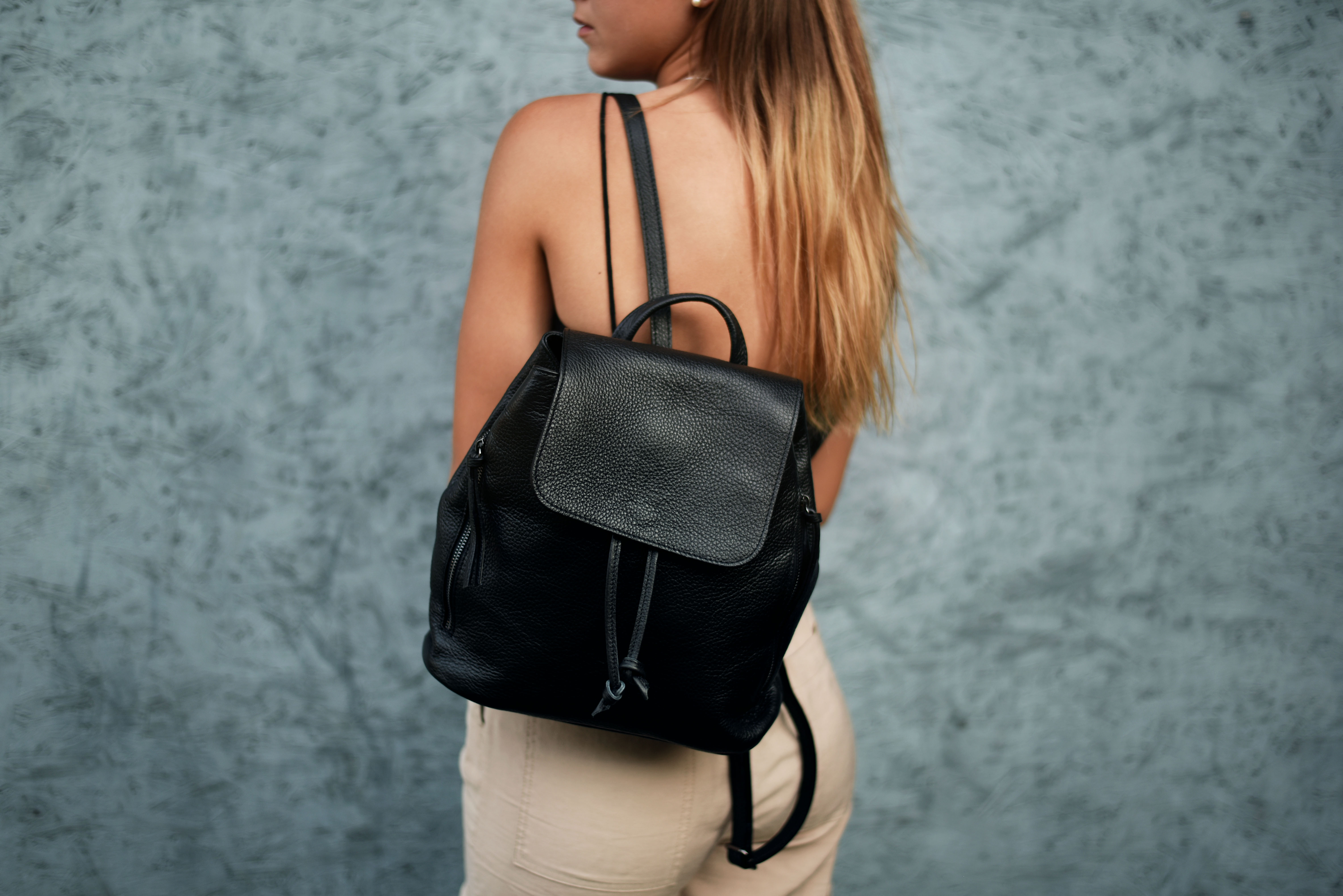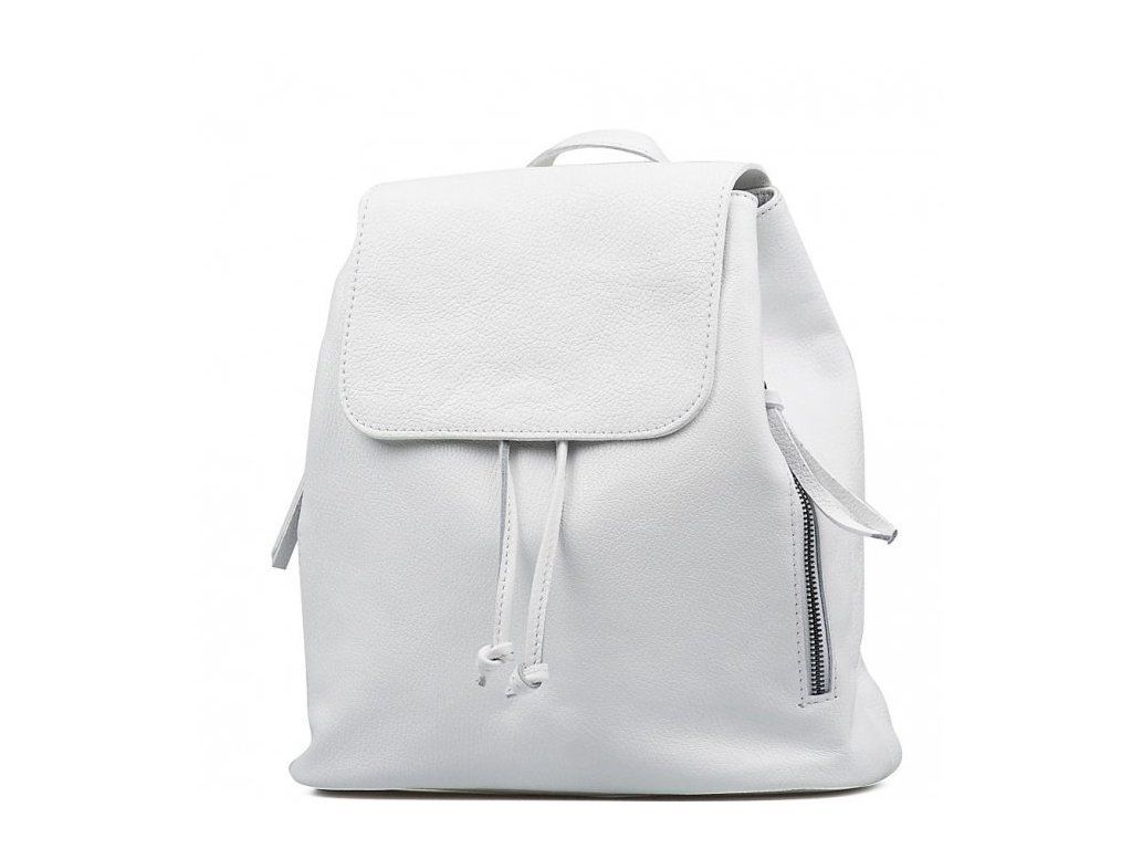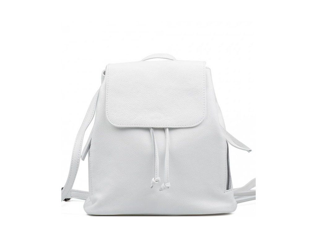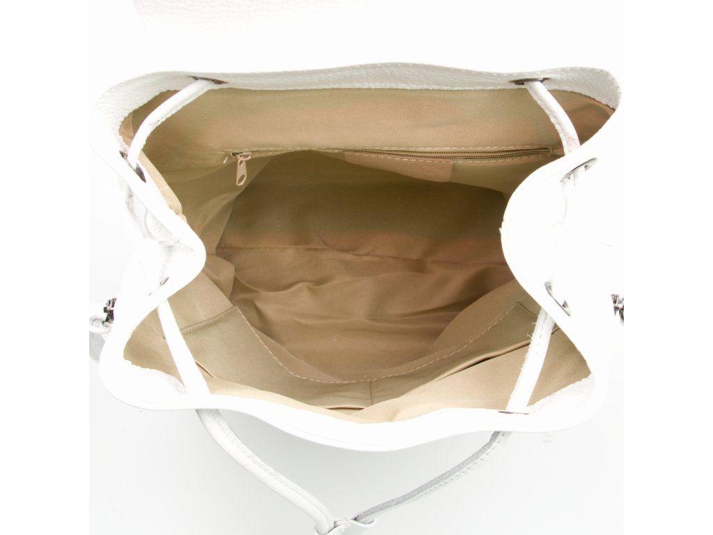 Dámsky kožený batôžtek v bielej farbe. Po bokoch je kabelka vybavená funkčnými vreckami na zips. Kovanie je strieborné. Horná časť batôžku sa sťahuje koženou šnúrkou. Kabelka sa zatvára klopou na cvoček. Interiér disponuje jedným veľkým úložným vreckom a malými po bokoch.