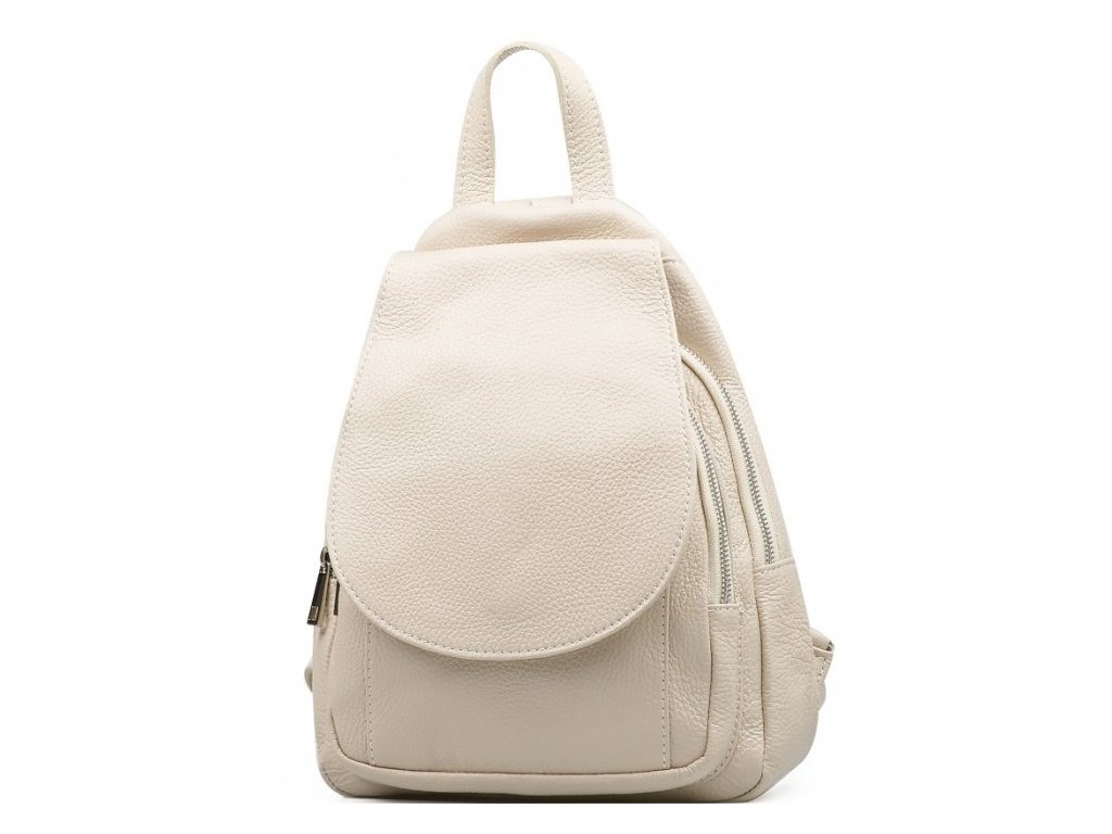Dámsky kožený mestský batôžtek v béžovej farbe. Praktický a elegantný batôžtek s dostatkom úložného priestoru. Batôžtek má dve úložné vrecká so samostatným vstupom s uzáverom na zipsy. Zadná strana batôžku disponuje malým úložným vreckom na zips. Batôžtek sa uzatvára klopou na cvoček.
