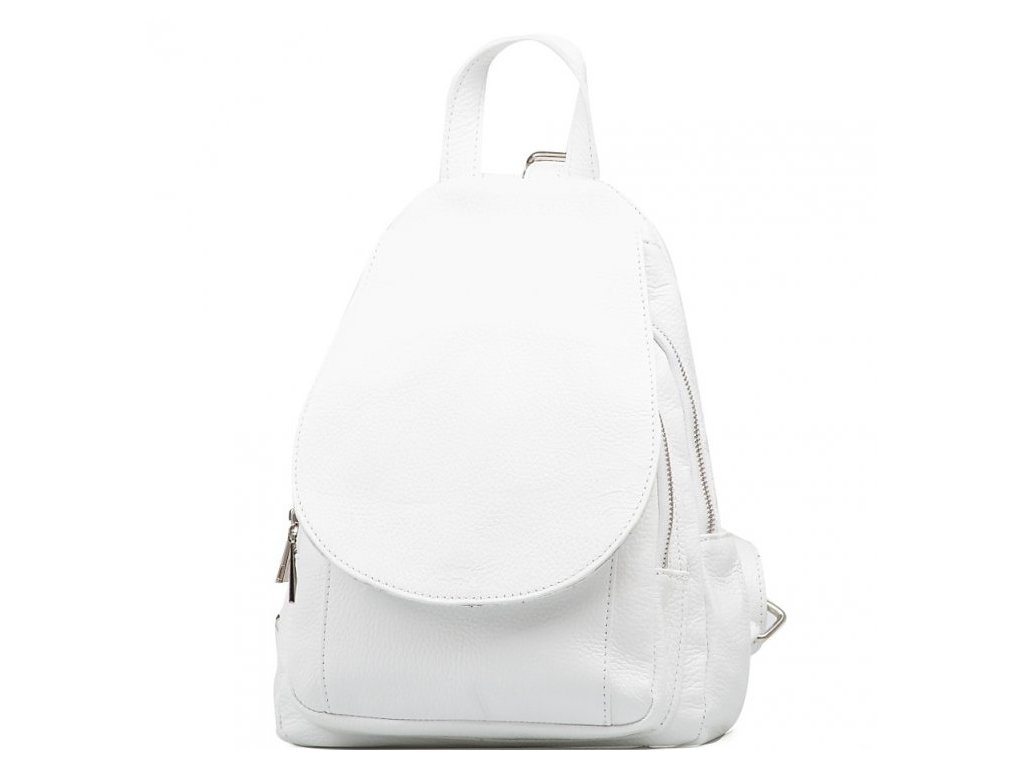 Dámsky kožený mestský batôžtek v bielej farbe. Praktický a elegantný batôžtek s dostatkom úložného priestoru. Batôžtek má dve úložné vrecká so samostatným vstupom s uzáverom na zipsy. Zadná strana batôžku disponuje malým úložným vreckom na zips. Batôžtek sa uzatvára klopou na cvoček.