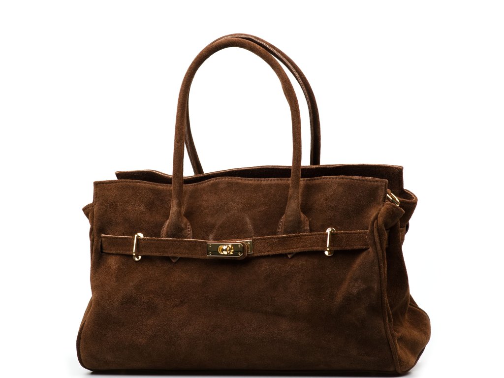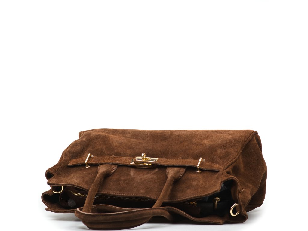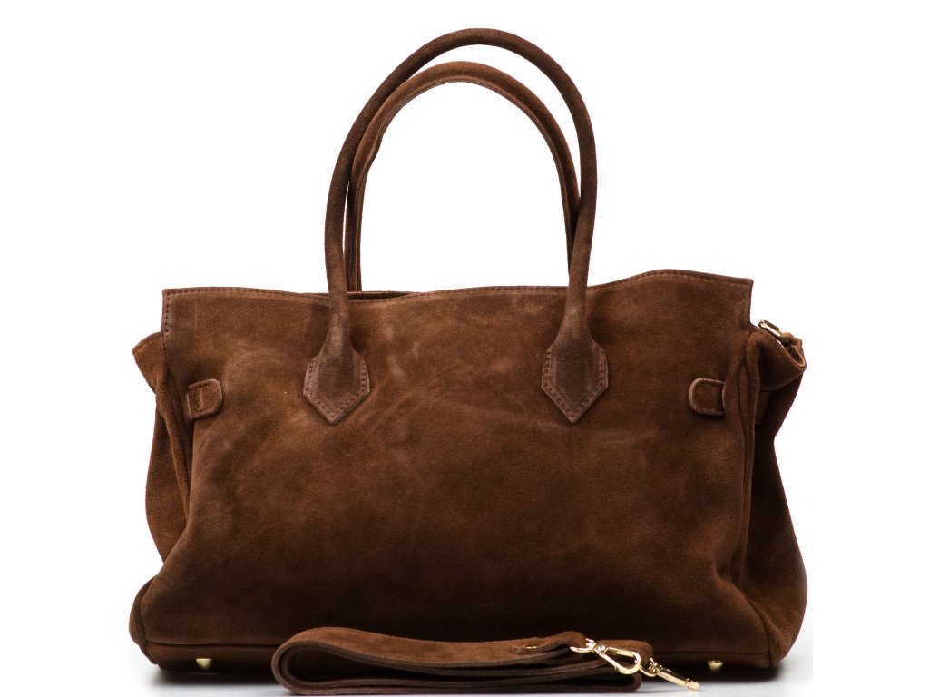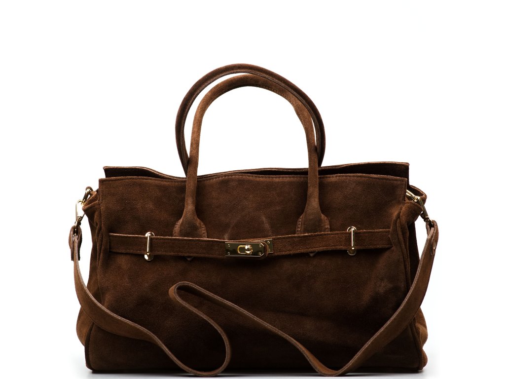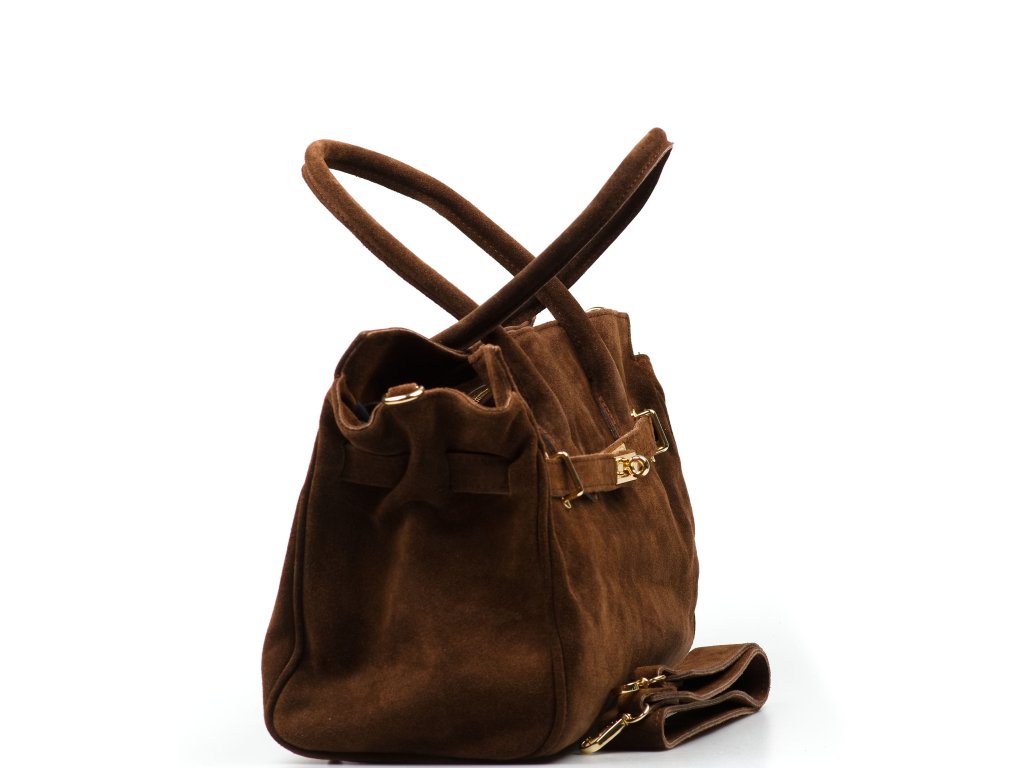 Kožená kabelka do ruky aj cez rameno v hnedej farbe. Interiér kabelky disponuje troma vreckami, pričom jedno je uzatvárateľné zipsom. Kabelka má aj malé bočné vrecká. Súčasťou kabelky je prídavný popruh s karabínami. Hornú časť kabelky zdobí kožený popruh so zlatými sponami.