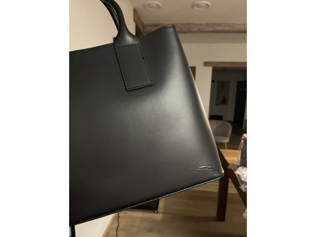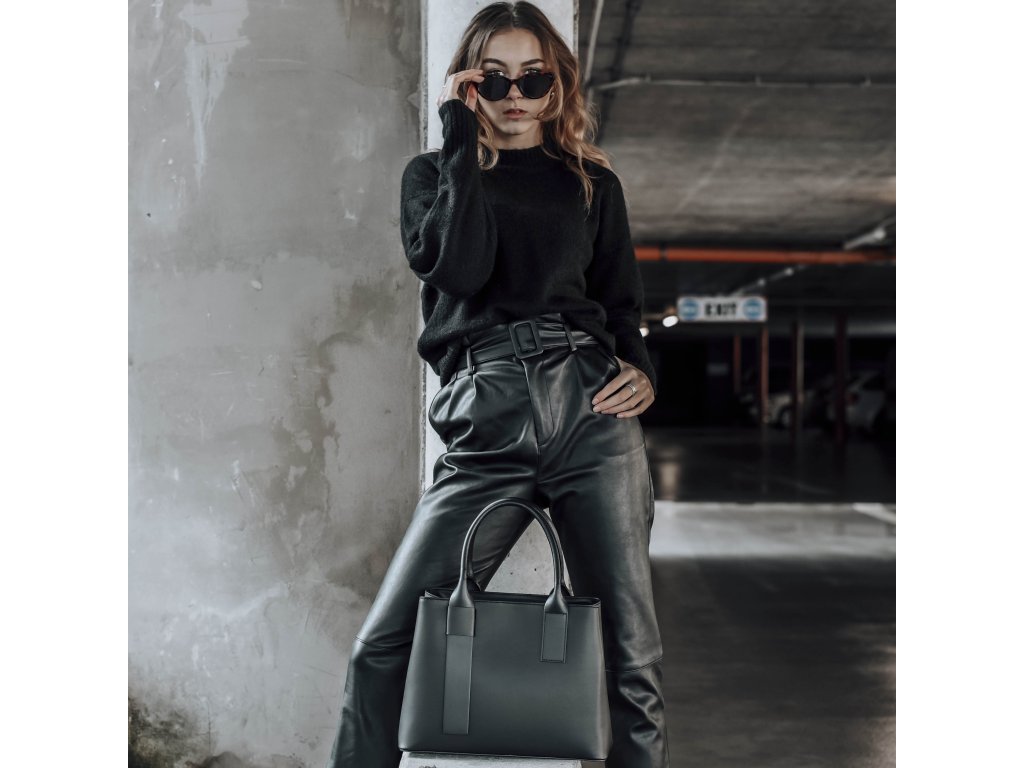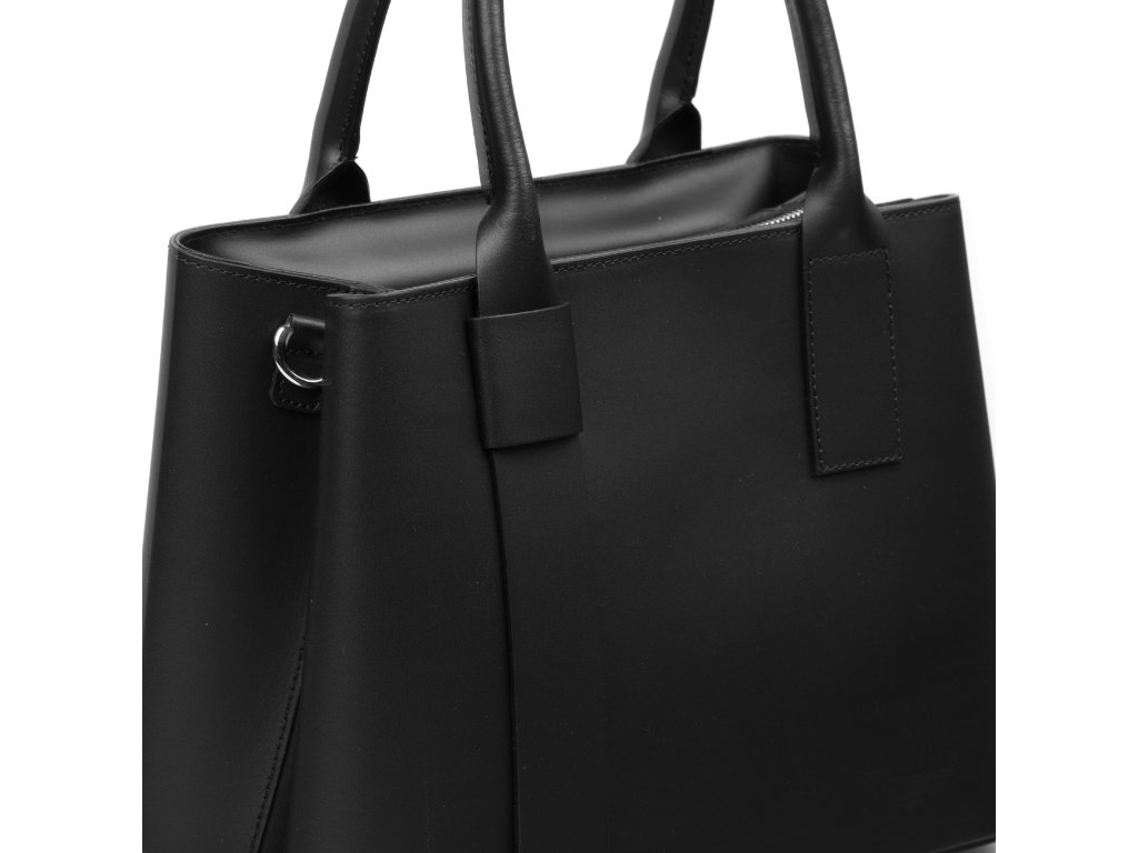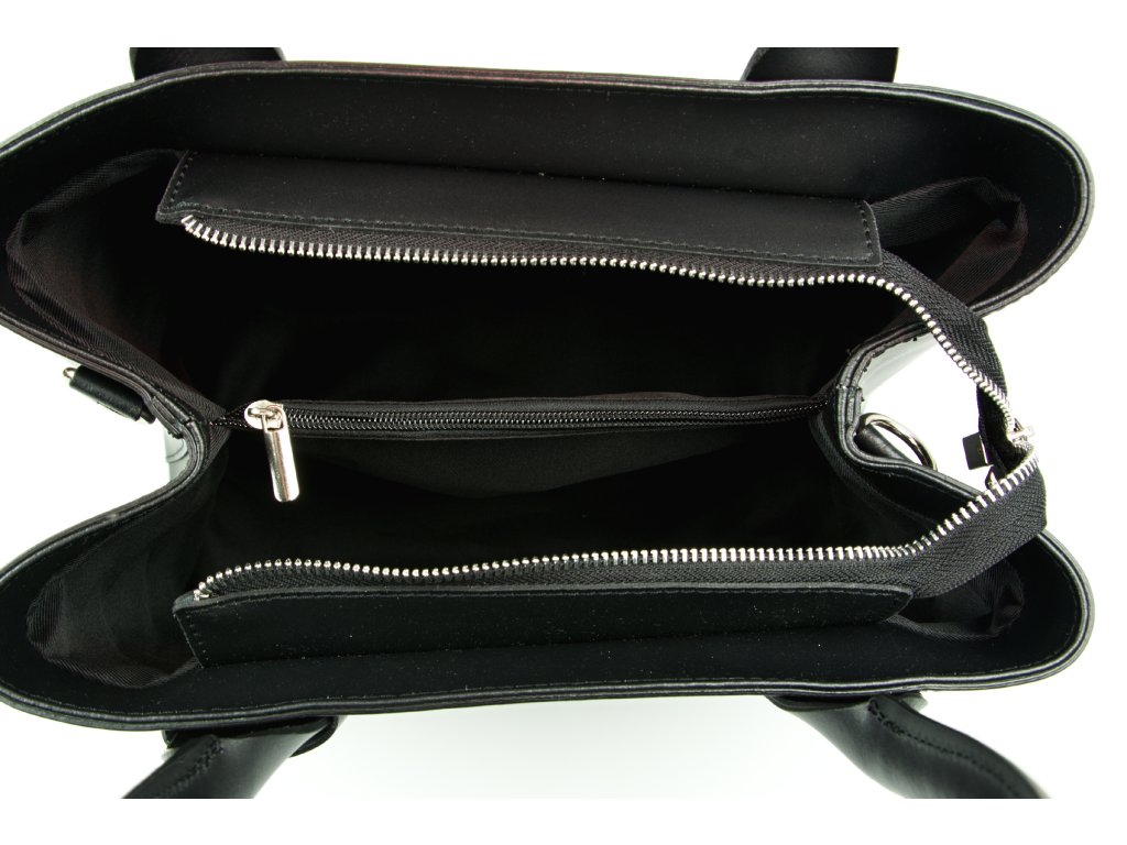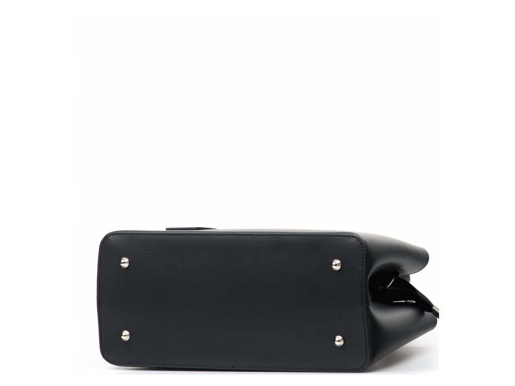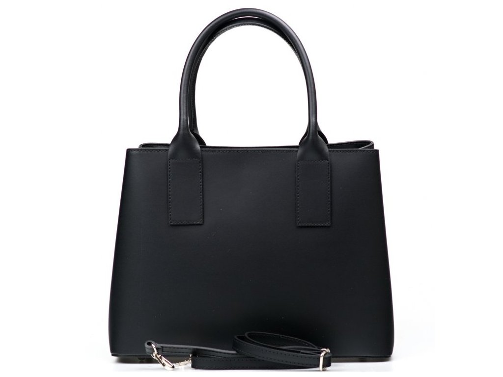 Luxusná kožená kabelka do ruky aj cez rameno v čiernej farbe. Kabelka je vyrobená z hladkej kože. Súčasťou kabelky je prídavný popruh s karabínami. Interiér kabelky má k dispozícii tri úložné vrecká, uprostred na zips. Kabelka sa uzatvára zipsom.